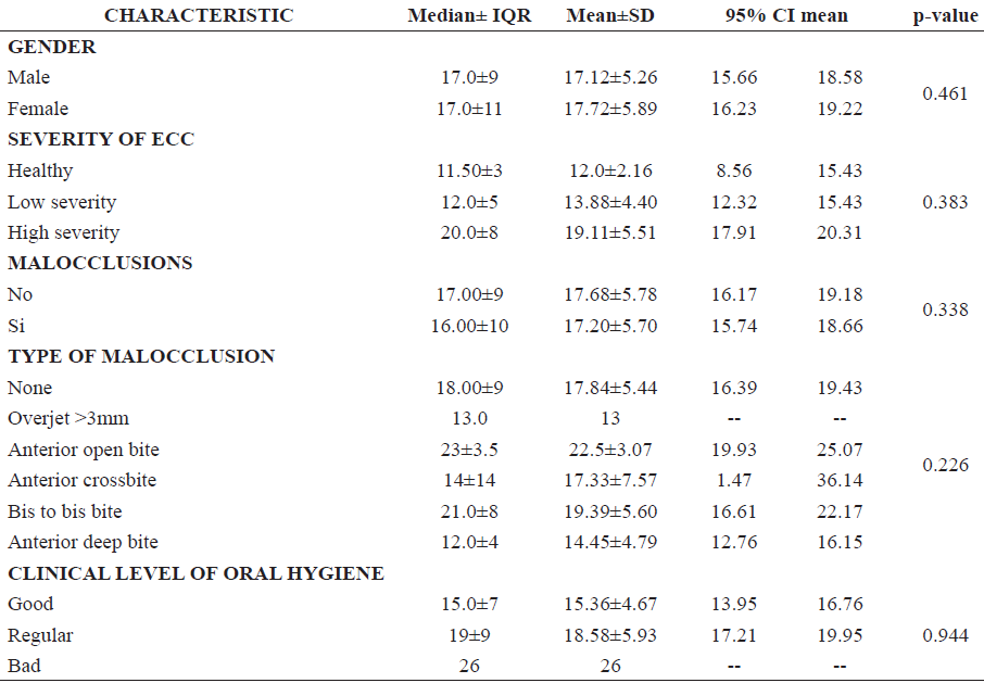 Regarding the scores obtained from the ECOHIS questionnaire, no differences (p>0.05) were found among categories grouped by gender, severity of ECC, presence, and type of malocclusion, and clinical level of oral hygiene (Table 2).