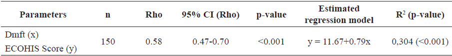 Table 3 displays the responses to each item in the ECOHIS questionnaire, which were divided into the child and family impact assessment and were reported by the caregiver. Table 4 shows that the dmft index values and the ECOHIS score presented a positive and moderately significant relationship (95% CI, rho value: 0.47 – 0.70, p<0.001).