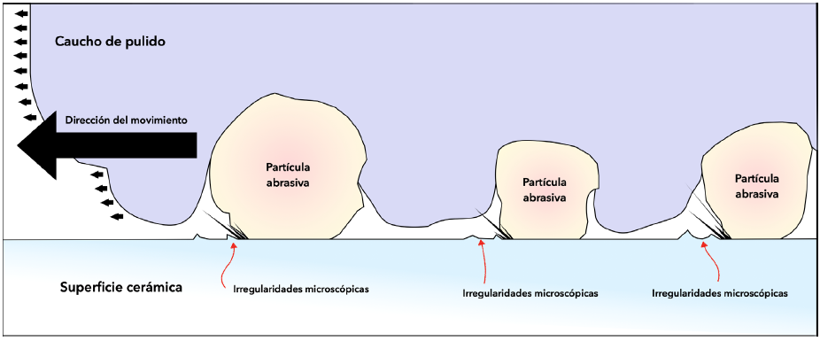 En la práctica clínica, el método de pulido mecánico es utilizado para el acabado intraoral y extraoral de restauraciones cerámicas, el cual utiliza una acción puramente mecánica. Los sistemas de pulido generalmente presentan un cabezal giratorio donde gran número de abrasivos están incrustados en su superficie, los cuales son básicamente un poco más duros o similares a los de la cerámica a pulir. Las partículas abrasivas, normalmente de carburo de silicio y diamante, presentan bordes de microcorte que eliminan las regiones de fallas y poros de tamaño microscópico al ejercer presión en la superficie de cerámica (Figura 1). Las cerámicas sinterizadas tienen una estructura heterogénea y están formadas por cristales finos y poros, por lo que se utilizan polvos de diamante para obtener superficies lisas ya que funcionan de forma superior en la eliminación uniforme de irregularidades (9).