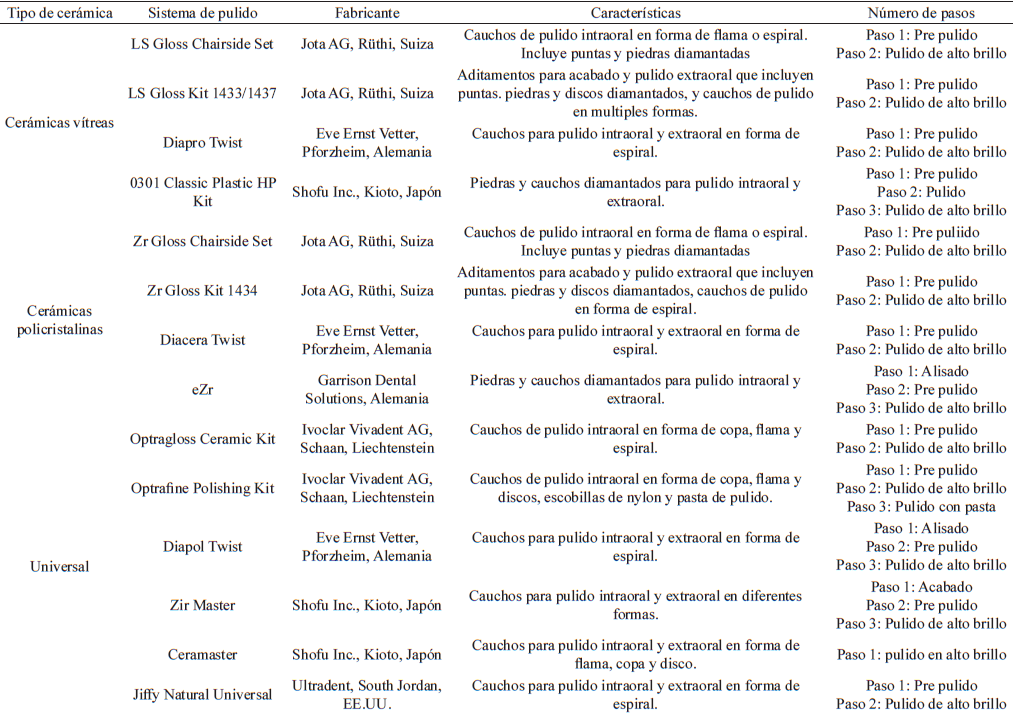 Existen muchos protocolos de pulido para eliminar o disminuir las imperfecciones que surgen durante el ajuste de restauraciones cerámicas y conseguir una superficie lisa y resistente (Tabla 1). Scherrer et al. compararon la Ra tras el pulido de cerámicas feldespáticas, disilicato de litio y zirconia utilizando un sistema de pulido específico al material de 2 pasos y un sistema universal de 3 pasos (Jota AG, Rüthi, Suiza). Se encontró que protocolo de pulido de 2 pasos mostró tan buenos resultados como el de 3 pasos, sin embargo, se consiguió una superficie más lisa para la zirconia y disilicato de litio que para la cerámica feldespática con ambos protocolos (18).