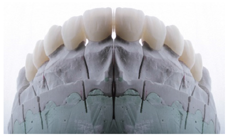 La impresión fue realizada con silicona por adición en ambas arcadas, acompañado de un registro de mordida, el mismo fue enviado al laboratorio para la confección de las coronas y la carilla de disilicato de litio, acompañado también de una guía para la apreciación del color de las preparaciones y de los dientes antagonistas de manera detallada para cada pieza dentaria, acompañado de las fotografías digitales en vista frontal y lateral (izquierda y derecha), tomadas con abrebocas para una mejor apreciación y visualización, proporcionando así las herramientas necesarias para una buena comunicación con el laboratorio. Dentro de las indicaciones se detallaba la solicitud de confección de coronas de disilicato de litio de las piezas 11, 12, 13, 14, 21, 22, 24, 25 y laminado para carillas de la pieza 23, con los colores predominantes A2 AD (Ivoclar Vivadent).