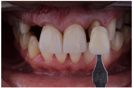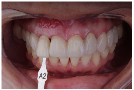 En la selección del color de las láminas de cerámica de disilicato de litio con el colorímetro de tonalidad A-D (Ivoclar Vivadent), pudo observarse el predominio de color A2. Para la selección del color fueron utilizados los mismos parámetros de iluminación y humedad, acompañado de la referencia de los dientes antagonistas (inferiores) que fueron utilizados como una referencia de la guía de colores (Figura 8).