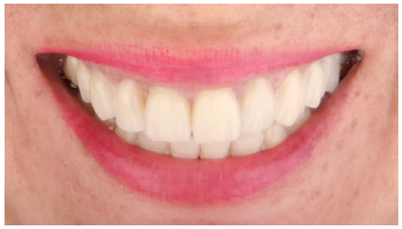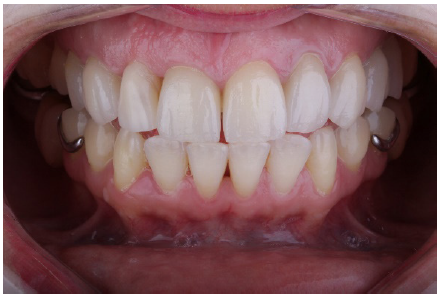 La preparación de los provisorios de las piezas tratadas es una parte fundamental del tratamiento de rehabilitación estética, pues la conservación y preservación de la salud periodontal es fundamental, para poder obtener el contorno, forma y color adecuados, así como la posición, apoyo labial y la fonética, entre otros factores asociados para el éxito de la rehabilitación. En esta etapa también fue realizado un ajuste de las restauraciones indirectas, con el fin de verificar la adaptación marginal, extensión, tamaño y simetría de cada pieza dentaria (Figura 9).