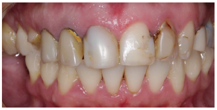 Dentro de la inspección clínica fue valorado el estado de salud periodontal como favorable, con una desviación de la línea media, al igual que las restauraciones defectuosas con resina compuesta en las piezas: 11, 21, 22, 23; corona metolocerámica en el: 12 y 13, en la pieza 12 fue observada un área de fractura de la cerámica a nivel cervical del sector mesial y por lo que se observa parte del metal en el área cervical de ambos dientes (Figuras 1 y 2).Por lo que de acuerdo al caso fue realizado un plan de tratamiento en base a la evaluación, siendo informado y bajo consentimiento de la paciente según comité de Ética de la FOUNC.