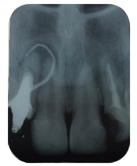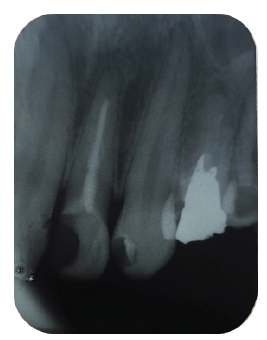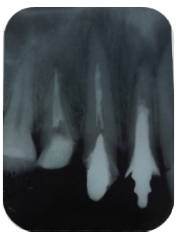 Al realizar la valoración radiográfica en las radiografías periapicales se observaron piezas dentarias con endodoncia defectuosa en las piezas 12, 13 y 22, en la pieza 12 se aprecia la presencia de un perno metálico con un proceso apical visible, con una fistula vestibular, que fue constatado con un mapeamiento con gutta-percha. (Figuras 3, 4 y 5)