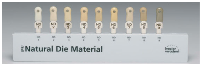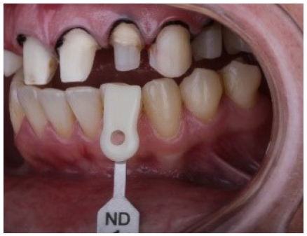 Por la situación presentada la obtención del color fue sumamente minucioso utilizando una iluminación y humedad adecuada, con ayuda del colorímetro IPS Natural Die Material Guide (Ivoclar Vivadent AG) (Figura 6), utilizado dentro de la práctica clínica para determinar la tonalidad del muñón y dar al laboratorio una idea de la base para una reproducción más fiel del color natural y uniforma de las piezas en rehabilitación, fueron también utilizados para este fin registros fotográficos, pudiendo observarse como color predominante el ND1. (Figura 7)