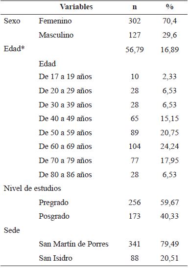 El género con mayor frecuencia fue el sexo femenino con 70,4 % (n = 302); mientras que para el sexo masculino fue de 29,6 % (n = 127). De acuerdo al grupo etario, la edad promedio fue de 56,79 años con una desviación estándar de 16,89, ocupando el mayor porcentaje el rango entre los 60 y 69 años de edad con 24,24 % (n = 104); y el menor entre los 17 a 19 años de edad con 2,33 % (n = 10). Los estudiantes de pregrado fueron los que realizaron mayor cantidad de diagnósticos con 59,67 % (n = 256); y los estudiantes del servicio de posgrado en Rehabilitación Oral realizaron el 40,33 % (n = 173). La sede de San Martín de Porres fue en donde se hizo la mayor cantidad de diagnósticos, con 79,49 % (n = 341); mientras que en la sede de San Isidro fue de 20,51 % (n = 88) (tabla 1).