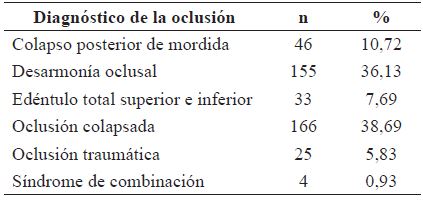 El diagnóstico con mayor porcentaje fue de oclusión colapsada con 38,69 % (n = 166), seguido de desarmonía oclusal con 36,13 % (n = 155), colapso posterior de mordida con 10,72 % (n = 46), edéntulo total superior e inferior con 7,69 % (n = 33), oclusión traumática con 5,83 % (n = 25), y síndrome de combinación con 0,93 % (n = 4) (tabla 2).