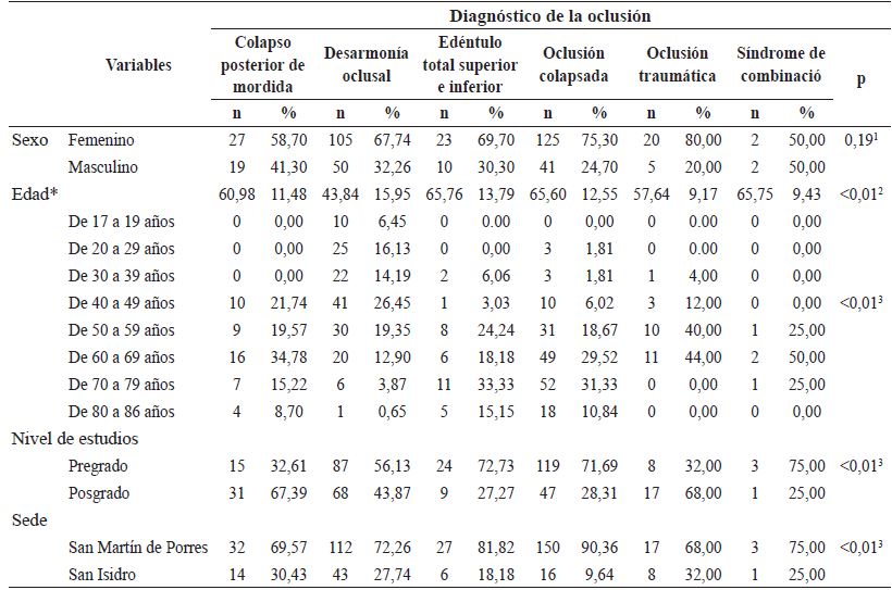 Finalmente, la tabla 3 también muestra los resultados según la sede de evaluación. Para los casos de oclusión colapsada, el 90,36 % (n = 150) pertenece a la sede de San Martín de Porres; y el 9,64 % (n = 16), a la sede de San Isidro. En cuanto a los casos de desarmonía oclusal, el 72,26 % (n = 112) pertenece a la sede de San Martín de Porres; y el 27,74 % (n = 43), a la sede de San Isidro. Los casos de colapso posterior de mordida fueron registrados en un 69,57 % (n = 32) en la sede de San Martín de Porres, y en un 30,43 % (n = 14) en la sede de San Isidro. Los casos de edéntulo total superior e inferior fueron reportados en un 81,82 % (n = 27) en la sede de San Martín de Porres, y en un 18,18 % (n = 6) en la sede de San Isidro. Los casos de oclusión traumática fueron diagnosticados en un 68 % (n = 17) en la sede de San Martín de Porres, y en un 32 % (n = 8) en la sede de San Isidro. Por último, los casos de síndrome de combinación fueron reportados en un 75 % (n = 3) en la sede de San Martín de Porres, y en un 25 % (n = 1) en la sede de San Isidro.