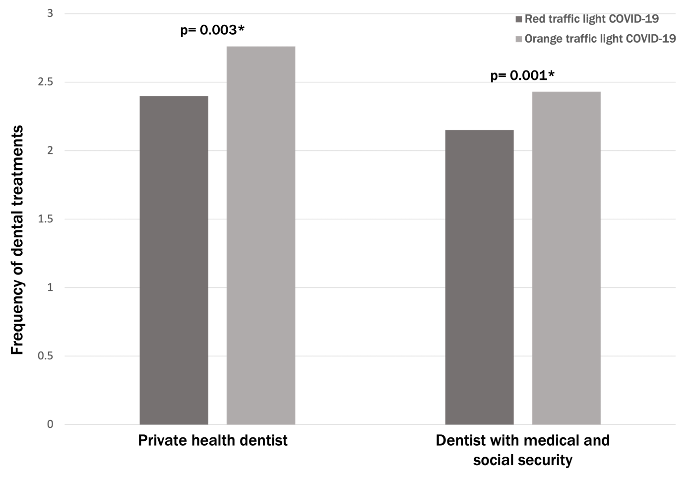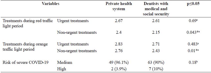 This research was developed during two COVID traffic light periods (red and orange) and before the start of the vaccination campaign. Mexicans felt unsafe with a new disease that lacked effective preventive healthcare or medical treatment (17). Most Mexican dentists have not financial security in the private health sector. Therefore, they must provide dental care in order to obtain economic resources. This study hypothesized that economic needs lead dentists to keep providing health care despite the risk of infection with COVID-19 and the government's recommendations to provide only urgent treatment during orange and red traffic light periods (12). As expected, private sector dentists did more urgent and non-urgent treatments during both epidemiological traffic light periods. International COVID-19 guidelines suggest that dental care must be provided only in urgent cases (2, 4). In the study, urgent treatments were more frequent during both epidemiological traffic light periods.