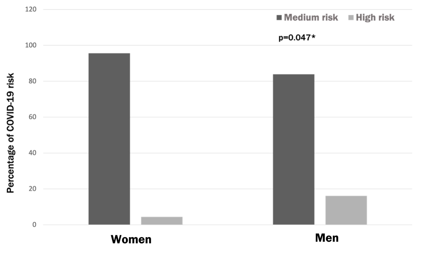 Participants showed a medium risk of developing severe COVID-19 (92.5%). There were no statistical differences between private health dentists and those with medical or social security (Table 2). The analysis of dental treatments during COVID-19 traffic light periods determined that private health dentists did more urgent and non-urgent treatments during orange and red traffic light periods than their peers (Table 2 shows frequency of dental treatments as mean values). However, statistical differences were found when the Mann-Whitney U test was performed to compare non-urgent treatments done by private health dentists and their peers during orange and red traffic light periods. In addition, both groups of dentists did more non-urgent treatments during orange than red traffic light periods, showing a statistical difference when performing a Wilcoxon test (Figure 1). Men reported a statistically significant (p = 0.047) greater risk of COVID-19 complications than women (Figure 2).