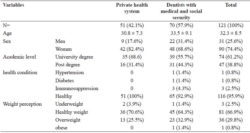 The study included 121 participants with an average age of 32.2 ± 8.5 years. Most were women: 74.4%. Dentists with just university degree were the 61.2% of the sample. Most of the dentists surveyed reported being healthy (95.5%). Comorbidities, hypertension, diabetes, and immunosuppression-related diseases corresponded to 4.1% of the sample. Participants who reported a healthy weight accounted for 66.9% of the total. Overweight corresponded to 29.8%. Dentists were divided into two main groups according to their economic backgrounds: i) private health dentists, i.e., those engaged in private practice, without medical or social security from government or private institutions; and ii) dentists with medical and social security (Table 1).