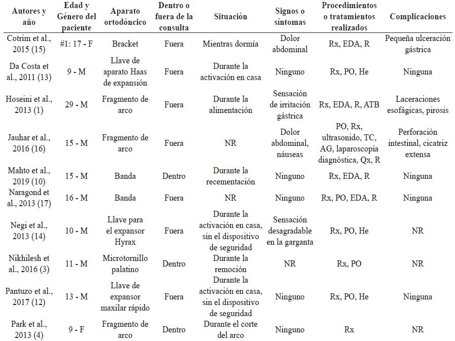 11. Tripathi T, Rai P, Singh H. Foreign body ingestion of orthodontic origin. Am J Orthod Dentofacial Orthop [Internet]. 2011; 139(2): 279-283. Disponible en: https://www.ajodo.org/article/S0889-5406(10)00855-3/fulltext