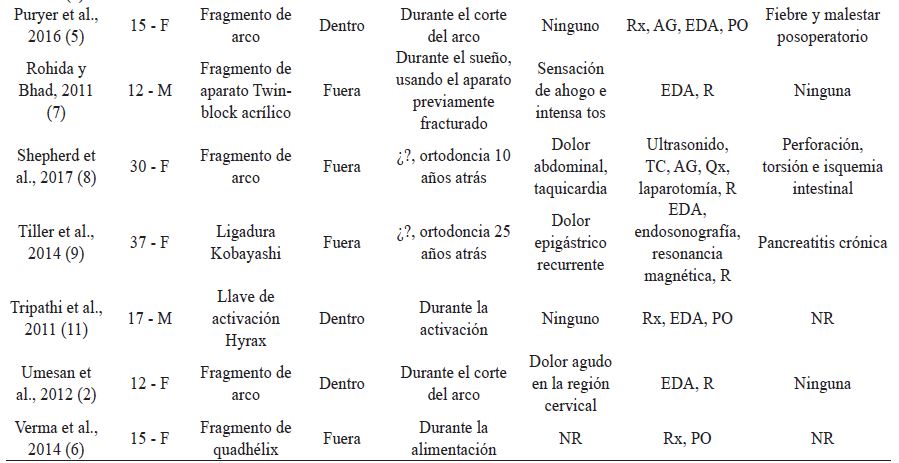 En cuanto a las complicaciones, 6 casos no presentaron, 6 casos sí y en los 5 restantes los autores no reportaron. Las complicaciones reportadas son de diversa índole y severidad; se destaca la señalada por Jauhar et al. (16), donde un joven de 15 años, después de dos semanas de haber ingerido un fragmento de arco, consulta en un servicio de urgencia por dolor abdominal y náuseas; luego del examen clínico y un estudio imagenológico, se diagnosticó una perforación intestinal que requirió una cirugía para su retiro, que finalmente implicó una extensa cicatriz abdominal como secuela. El segundo caso llamativo es el presentado por Shepherd et al. (8), donde la paciente, luego de 10 años post tratamiento ortodóncico, sufrió una perforación y torsión intestinal producto de un alambre ingerido mientras usaba aparatología; debido a ello, requirió una extensa cirugía abdominal para su resolución.