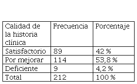 Luego de realizar el análisis estadístico de los datos obtenidos (tabla 1) se encontró que 114 (53,8 %) historias clínicas tienen una calidad por mejorar, 89 (42 %) tienen una calidad satisfactoria, mientras que 9 (4,2 %) tienen una calidad deficiente. De este modo, se obtuvo que la calidad de las historias clínicas de un centro de salud de Ica, entre los años 2019 y 2021, está por mejorar.