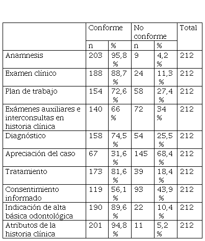 Asimismo, en la tabla 2 se puede observar la evaluación de cada punto evaluado mediante la auditoría de las historias clínicas. Respecto a la anamnesis, se encontró 203 historias clínicas (95,8 %) conformes y 9 (4,2 %) no conformes. En cuanto al examen clínico, se obtuvo 188 (88,7 %) conformes y 24 (11,3 %) no conformes. En cuanto al plan de trabajo, 154 (72,6 %) fueron conformes y 58 (27,4 %) no conformes. Respecto a los exámenes auxiliares e interconsultas en historia clínica, 140 (66 %) fueron conformes y 72 (34 %) no conformes. En cuanto al diagnóstico, 158 (74,5 %) estuvieron conformes y 54 (25,5 %) no conformes. Respecto a la apreciación del caso, 67 (31,6 %) fueron conformes y 145 (68,4 %) no conformes. Considerando el tratamiento, 173 (81,6 %) fueron conformes y 39 (18,4 %) no conformes. En cuanto al consentimiento informado, 119 (56,1 %) estuvieron conformes y 93 (43,9 %) no conformes. Respecto a la indicación de alta básica odontológica, 190 (89,6 %) resultaron conformes y 22 (10,4 %) no conformes. Considerando los atributos de la historia clínica, 201 (94,8 %) estuvieron conformes y 11 (5,2 %) no conformes. Finalmente, al encontrarse 93 (43,9 %) historias clínicas que no cuentan con consentimiento informado, esto puede resultar perjudicial para el propio odontólogo ante algún problema legal que pueda surgir.