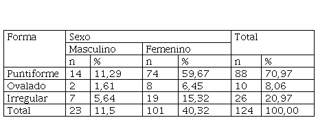 De los 124 tonsilolitos encontrados, la forma más frecuente fue la puntiforme con 71,96 % (n = 88); seguida de la irregular con 21,96% (n = 26); y, finalmente, la ovalada con 8,06 % (n = 10) (tabla 9).
