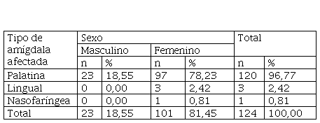 Los tonsilolitos encontrados afectaron, principalmente, a las amígdalas palatinas (figura 1), con un 96,8 % (n = 120); a las amígdalas linguales (figura 2), con un 2,4 % (n = 3); y, finalmente, a las amígdalas nasofaríngeas (figura 3), con un 0,8 % (n = 1) (tabla 10).