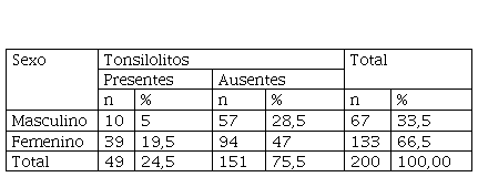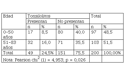 Presentaron tonsilolitos el 8,5 % (n = 17) de TCHC de pacientes menores de 50 años y el 16 % (n = 32) de TCHC de pacientes mayores de 50 años. Por tanto, se encontró una asociación significativa entre el grupo etario mayor a 50 años y los tonsilolitos (p < 0,05) (tabla 3).