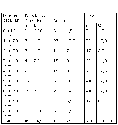 Las décadas de vida con mayor frecuencia de tonsilolitos fueron la de 51 a 60 años, con 6 % (n = 12), y la de 61 a 70 años, con 7,5 % (n = 15); y las de menor frecuencia fueron la primera vida (0 a 10 años) y la de 81 a 90 años, ambas con 0 % (n = 0) (tabla 2).