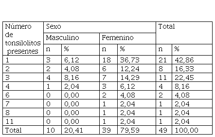 En las 49 TCHC con presencia de tonsilolitos se encontraron 124 tonsilolitos en total. De dichas TCHC, el 42,86 % (n = 21) presentaron un solo tonsilolito; y el 57,14 % (n = 28), más de uno por TCHC. La mayor cantidad de tonsilolitos encontrados en una sola TCHC fue 11 (tabla 5).