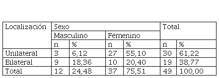 Del total de 49 TCHC con tonsilolitos, el 61,2 % (n = 30) fueron unilaterales y el 38,8 % (n = 19) fueron bilaterales (tabla 6).