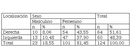 Del total de 124 tonsilolitos evaluados, el lado de mayor frecuencia fue el lado derecho con un 51,6 % (n = 64); asimismo, el lado izquierdo presentó un 48,4% (n = 60). No se encontró una asociación significativa entre la localización derecha o izquierda y los tonsilolitos (p > 0,05) (tabla 7).