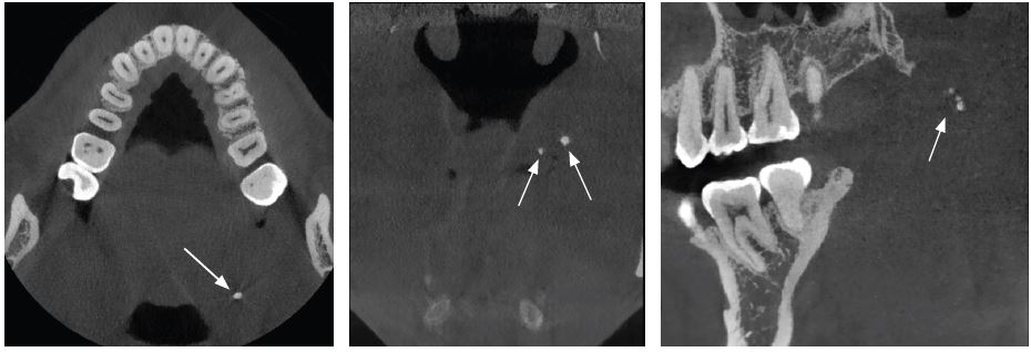 La tomografía computarizada de haz cónico (TCHC) es una técnica imagenológica que se dio a conocer a finales de los años 90, y cuyo auge ha sido exponencial en la profesión odontológica. En ella, se puede realizar un análisis multiplanar dinámico que proporciona valiosa información para identificar de una forma más precisa estas calcificaciones, las cuales se identifican en la TCHC como pequeñas imágenes hiperdensas similares al hueso. Estas calcificaciones también se pueden observar en radiografías panorámicas, aunque la interpretación se hace compleja por la superposición de estructuras óseas (2,6, 8).