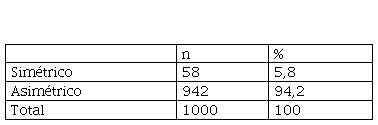 En la tabla 2, que muestra los resultados al aplicar el índice de asimetría según el método de Habets, se observa una frecuencia de asimetría en 942 radiografías (94,2 %), y de simetría en 58 radiografías (5,8 %).