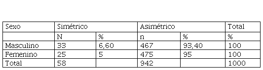 En la tabla 3, respecto a la asimetría de acuerdo al sexo, se observa que no se presentó mayor significancia en relación con el sexo: del total de hombres, 467 radiografías (93,40 %) presentaron asimetría; mientras que del total de mujeres, 475 radiografías (95 %) presentaron asimetría.