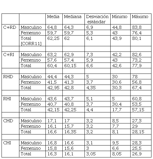 En la tabla 4, se evaluaron únicamente las medidas obtenidas, en milímetros, de las variables dependientes. Así, pues, se encontró que la medida promedio de la C+RD en las radiografías estudiadas era de 64,8 mm en hombres y 59,7 mm en mujeres; seguidas de las medidas de la RHD, 44,4 mm en hombres y 41,5 mm en mujeres; por último, las medidas encontradas en la distancia de CHI fueron 16,8 mm en hombres y 15,8 mm en mujeres. Estos datos indican que la altura vertical de la rama y cóndilo más rama fue mayor en el sexo masculino que en el femenino.