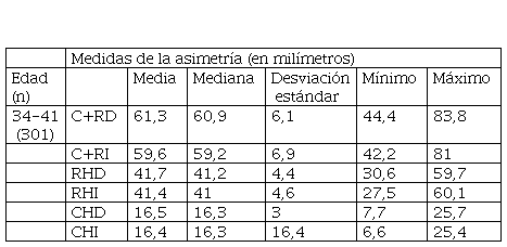En la tabla 5, se tomó en cuenta el intervalo de edad que presentó mayor casos de asimetría, el de 31-41 años de edad, con un total de 301 radiografías. Se encontró que, en el intervalo señalado, la C+RD tiene un mínimo de 44,4 mm y un máximo de 83,8 mm; la C+RI, un mínimo de 42,2 mm y un máximo de 81 mm; la RHD, un mínimo de 30,6 mm y un máximo de 59,7 mm; la RHI, un mínimo de 27,5 mm y un máximo de 60,1 mm; la CHD, un mínimo de 7,7 mm y un máximo de 25,7 mm; y la CHI, un mínimo de 6,6 mm y un máximo de 25,4 mm.