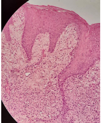 Bajo anestesia local con infiltración de lidocaína se realiza una incisión en ojal de espesor total y mínimo margen de seguridad para biopsia excisional. Se remite para su estudio histopatológico, y se informa que la muestra es XV. Se describe un fragmento tisular constituido por epitelio paraqueratinizado con crestas elongadas, hiperplasia focal y espongiosis. Por debajo, tejido conjuntivo con células grandes de citoplasma espumoso en las papilas conjuntivas; en profundidad, tejido conjuntivo fibroso con elementos vasculares e infiltrados inflamatorios crónicos con predominio linfocitario (figura 2).