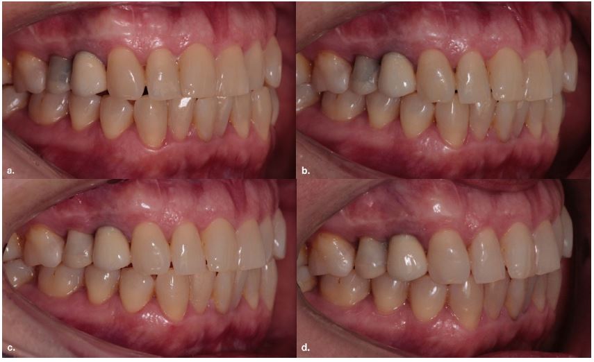 Paciente de sexo femenino de 47 años que acudió a la consulta por presentar discromía en la pieza 15 desde hace un año. En el examen clínico intraoral, se observó que dicha pieza presentaba una incrustación de resina en buen estado y discromía (figura 1a). En el examen radiográfico, se observó un material radiopaco coronal y obturación de conducto. Según la evaluación clínica y radiográfica, se diagnosticó como tratamiento de conducto previo. Debido a que presentaba una restauración amplia en buen estado y por la negativa de la paciente a realizarse cualquier tratamiento de operatoria dental, se optó por utilizar BE con la técnica mixta. Se registró el color del diente en 5M1 con la guía Vita 3D Master (Vita 3D Master, VITA Zahnfabrik, Bad Säckingen, Alemania). Se realizaron dos aplicaciones de peróxido de hidrógeno al 35 % (Whiteness HP Maxx, FGM Dental Products, Joinville, SC, Brasil) en la superficie vestibular durante quince minutos cada una, dando como resultado un aumento en el valor de la pieza (figura 1b). Asimismo, se confeccionó una cubeta de acetato para el blanqueamiento domiciliario con peróxido de carbamida al 22 % (Whiteness Perfect, FGM Dental Products, Joinville, SC, Brasil), el cual fue utilizado por la paciente por dos semanas y se obtuvo un resultado de tono 3M2. La paciente continuó con el blanqueamiento domiciliario durante dos semanas más y registró el mismo resultado en el tono (figura 1c). Se le realizó un control clínico luego de seis meses, en el cual se observó que el color de la pieza se mantenía en el mismo tono, sin ninguna regresión ni sintomatología (figura 1d).