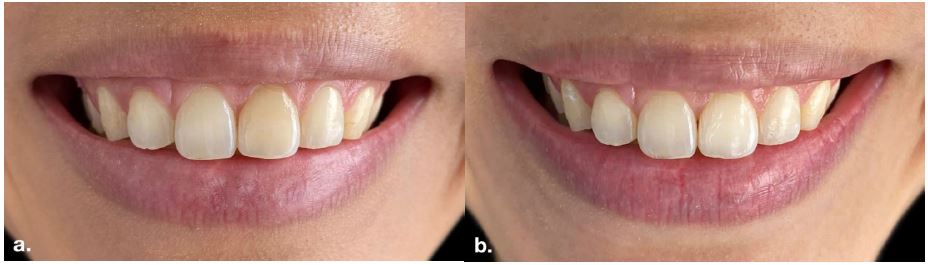 Paciente de sexo femenino de 37 años que acudió a consulta por discromía de la pieza 21. La paciente refiere que a los quince años sufrió de un trauma en dicha pieza y, años después, comenzó a notar el cambio de color. En el examen clínico, la pieza presentó un tono 3M2 y no tuvo sintomatología (figura 2a). En el examen radiográfico, se observa pieza 21 con ausencia de lesión periapical y sin restauraciones coronarias. Según la evaluación clínica y radiográfica, se diagnosticó metamorfosis cálcica. Se decidió realizar solo BE para no invadir dicha pieza con una sesión en consultorio utilizando peróxido de hidrógeno al 35 % (Whiteness HP Maxx, FGM Dental Products, Joinville, SC, Brasil); se confeccionó una cubeta para que la paciente utilice peróxido de carbamida al 22 % (Clariant, Angelus, Londrina, Brasil) y se le indicó el uso diario durante cuatro semanas. En el control semanal, se observó que el tono de la pieza cambió a 1.5M2. La paciente continuó utilizando el blanqueamiento domiciliario por tres semanas más y se le realizó un control clínico luego de seis meses, en donde se observó que el color de la pieza 21 era 1M2 y con ausencia de sintomatología (figura 2b).