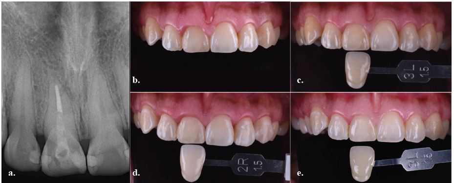Paciente de sexo femenino de 35 años que presentaba pieza 11 con discromía, restauraciones desbordantes y pigmentadas en las superficies proximales. En el examen radiográfico, se observó una imagen radiolúcida compatible con tratamiento de conducto subobturado, poste intrarradicular, el cual se realizó hace diez años (figura 3a). Se registró el color del diente en 3L2.5 (figura 3b). Se realizó BE en consultorio debido a la imposibilidad de realizar un BI, ya que la pieza presenta un poste intrarradicular. Se realizó aislamiento absoluto de la pieza; posteriormente, se realizaron dos aplicaciones de peróxido de hidrógeno al 35 % (Whiteness HP Maxx, FGM Dental Products, Joinville, SC, Brasil), el cual se colocó en la superficie vestibular y palatina durante veinte minutos, se registró el color final en 3L1.5 donde se observó una leve mejora en la tonalidad de la pieza dentaria (figura 3c). A los siete días se repitió el protocolo de blanqueamiento y se registró el color final en 2R 1.5, notándose una mejora significativa en la tonalidad de la pieza dentaria (figura 3d). Luego de seis meses se le realizó un control clínico, en el cual se observó que hubo una regresión de color hasta el tono 3L1.5, así como ausencia de cualquier complicación o sintomatología (figura 3e).