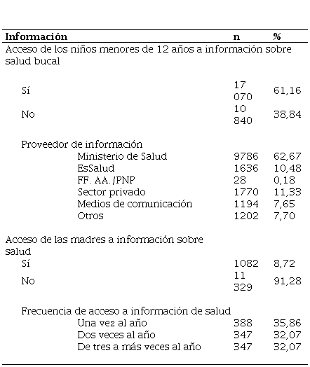 Del estudio de los niños menores de 12 años de edad, el 61,16 % (n = 17 070) tuvo acceso a información sobre salud bucal. De las madres, solo el 8,72 % (n = 1082) recibió información sobre salud. Con respecto al proveedor de información sobre salud bucal fueron las siguientes instituciones, en orden de prevalencia: Minsa con 62,67 % (n = 9786), sector privado con 11,33 % (n = 1770), EsSalud con 10,48 % (n = 1636), otros con 7,70 % (n = 1202), medios de comunicación con 7,65 % (n = 1194), y las FF. AA./PNP representan el 0,18 % (n = 28) (tabla 1).