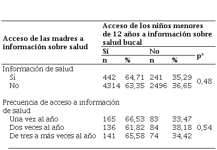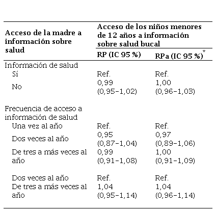 En lo referente al acceso a información sobre salud de la madre y acceso de los niños menores de 12 años de edad a información sobre salud bucal, no existe asociación entre estas variables, RP = 0,99 (IC 95 %: 0,965-1,02); y al considerar las covariables, tampoco existe asociación, RPa = 1,00 (IC 95 %: 0,96-1,03) (tabla 4).