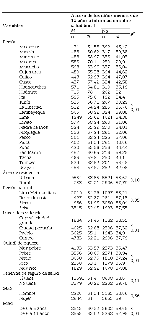 De los niños que recibieron información sobre el cuidado de salud bucal, las mayores frecuencias de acceso a información según región se encontraron en Huánuco con 78 %; según el área de residencia, destacó el urbano con 63,33 %; según la región natural, predominó Lima Metropolitana con 64,79 %; según el lugar de residencia, sobresale el pueblo con 65,1 %; según el índice de riqueza, predominó el muy pobre con 63,53 %; según la tenencia de seguro de salud, destacó el que tiene seguro de salud con 61,4 %; según el sexo de la persona, se encontró mayor frecuencia en el hombre con 61,34 %; según la edad, predominaron los niños entre 6 a 11 años con 62,02 %. Finalmente, se encontró asociación entre el acceso a información de los niños menores de 12 años y las variables región, lugar de residencia, quintil de riqueza y edad (p < 0,01) (tabla 3).