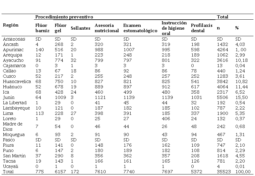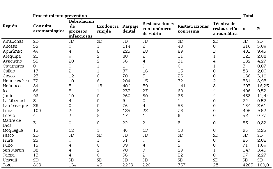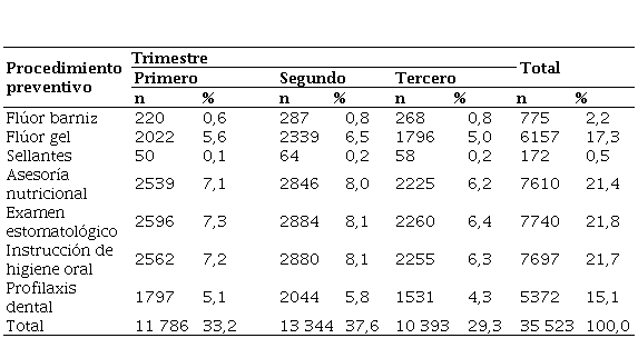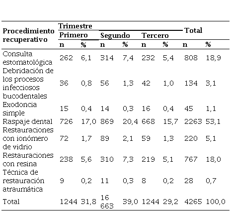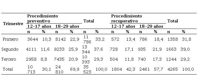 El estudio empleó una base de datos de acceso libre y dominio público, donde los participantes fueron anónimos, por lo que fue eximido de la evaluación de un comité de ética. En total, se realizaron 35 523 procedimientos estomatológicos de prevención, de los cuales el 37,3 % se desarrolló en el segundo trimestre y el 69,9 % en mujeres de entre 18 y 29 años. Asimismo, se realizaron 4265 procedimientos de recuperación de la salud bucal, de los cuales el 39,0 % se realizó durante el segundo trimestre y el 57,7 % en gestantes de entre 18 y 29 años (tabla 1).