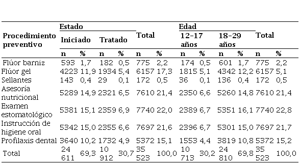 Las intervenciones preventivas que no se llegaron a completar representan la mayoría (69,3 %), siendo los más frecuentes el examen estomatológico (15,1 %), la instrucción de higiene oral (15,0 %) y la asesoría nutricional (14,9 %); por el contrario, los procedimientos que se concluyeron con relativo éxito fueron el examen estomatológico (6,9 %), la instrucción de higiene oral (6,6 %) y la asesoría nutricional (6,5 %). Las mujeres embarazadas entre 18 y 29 años presentaron mayor frecuencia de examen estomatológico (16,1 %) e instrucción en higiene oral (15,0 %); mientras que, en el grupo de 12 a 17 años, los procedimientos más recurrentes fueron la instrucción de higiene oral (6,7 %) y el examen estomatológico (6,7 %) (tabla 3).