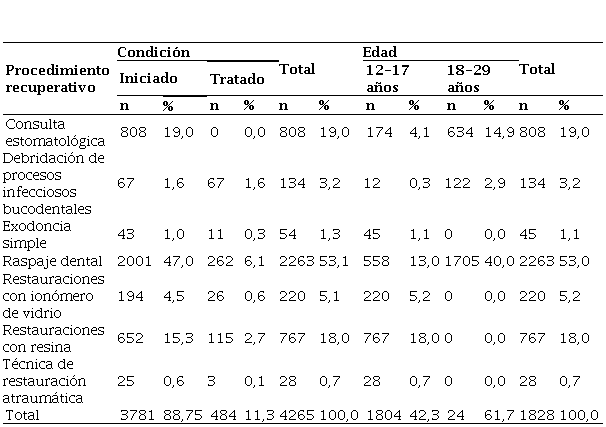 El 88,75 % de los procedimientos de recuperación solo llegaron a ser iniciados, siendo los más comunes el raspaje radicular (47,0 %), la consulta estomatológica (19,0 %) y las restauraciones con resina (15,3 %); aquellos que se concluyeron en mayor medida fueron el raspaje dental (6,1 %) y las restauraciones con resina (2,7 %). En el rango de edad entre 18 y 29 años, se presentaron con mayor frecuencia el raspaje dental (40,0 %) y la consulta estomatológica (14,9 %); y en edades de 12 a 17 años, fueron las restauraciones con resina (18,0 %) y el raspaje dental (13,0 %) (tabla 6).
