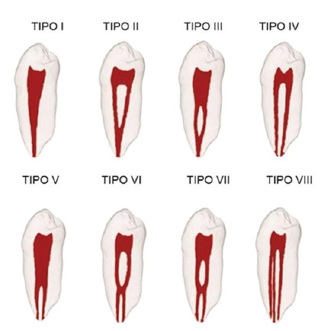 Los primeros premolares superiores generalmente presentan dos conductos, con dos forámenes apicales en un 72 %, considerándose según la clasificación de Weine como tipo III (figura 4), y según la clasificación de Vertucci como tipo IV (figura 1); y en menor porcentaje encontramos tres raíces con tres conductos, clasificándose según Vertucci como tipo VIII (8, 9) (figura 1).