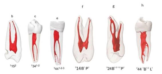 Otra clasificación es la de Ahmed et al. 8. quienes utilizan superíndices de la siguiente forma: el superíndice del lado derecho representa el número de raíces; el superíndice del lado izquierdo, el número de conductos; el número entero, el número de la pieza dentaria; la letra B, el conducto bucal; la letra L, el conducto lingual; y la letra P, el conducto palatino 8 (figura 3).