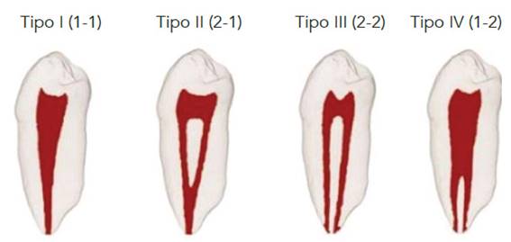 Existen otras clasificaciones de los conductos, como, por ejemplo, la de los conductos en forma de C. Una de ellas es la de Fan et al. 6. quienes utilizan cinco categorías, donde la I y la III son las de mayor frecuencia (figura 2). Moreno et al. mencionan que también se pueden presentar conductos en C en los primeros premolares inferiores en un 1,8 % (7).