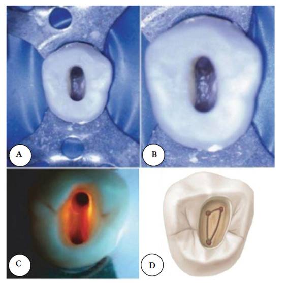 Cuando el primer premolar superior tiene un solo conducto, la apertura cameral tendrá forma ovalada (aplanada en sentido mesio-distal); en caso de que tenga dos conductos, tendrá forma de ocho; y en caso de que sean tres conductos, la apertura tendrá forma triangular, similar a la del primer molar superior 9 (figura 5).