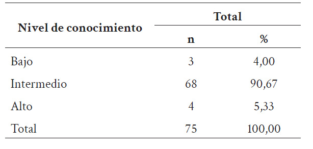 De los 75 estudiantes encuestados, el 66,67 % (n = 50) eran hombres, el 33,33 % (n = 25) eran mujeres, y el 96,00 % (n = 72) estaba en ciclo regular del programa de estudio. En cuanto al nivel de conocimiento sobre protección radiológica, riesgos y beneficios del uso de radiaciones ionizantes, el 4,00 % (n = 3) mostró un nivel bajo; el 90,67 % (n = 68), un nivel intermedio; y el 5,33 % (n = 4), un nivel alto (Tabla 1).