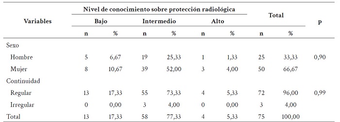 No se encontró una diferencia significativa en cuanto al nivel de conocimiento sobre protección radiológica según el sexo (p = 0,90) y la continuidad en el programa de estudio (p = 0,99). El 77,33 % (n = 58) obtuvo un nivel intermedio; el 17,33 % (n = 13), un nivel bajo; y el 5,33 % (n = 4), un nivel alto con relación a ambas variables (Tabla 2).