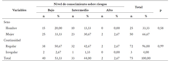 En cuanto a los conocimientos sobre los riesgos, no se encontró una diferencia significativa según el sexo (p = 0,58) y la continuidad en el programa de estudio (p = 0,99). El 53,33 % (n = 40) obtuvo un nivel bajo; el 44,00 % (n = 33), un nivel intermedio; y el 2,67 % (n = 2), un nivel alto con relación a ambas variables (Tabla 3).