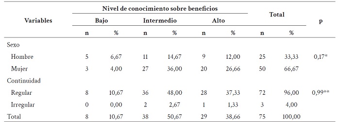 Respecto a los conocimientos sobre los beneficios del uso de radiación, no se encontró una diferencia significativa según el sexo (p = 0,17) y la continuidad en el programa de estudio (p = 0,99). El 50,67 % (n = 38) obtuvo un nivel intermedio; el 38,66 % (n = 29), un nivel alto; y el 10,67 % (n = 8), un nivel bajo con relación a ambas variables (Tabla 4).